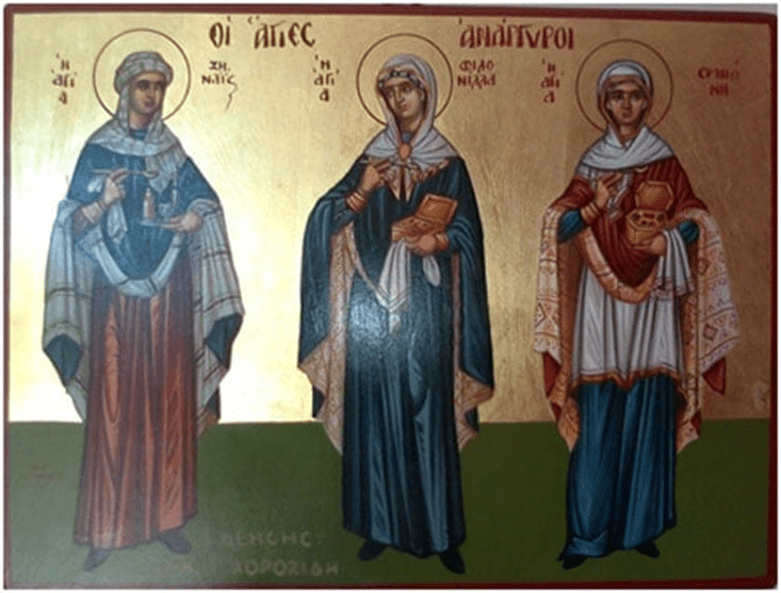 Medical science was served by all three Saints Anargyres, Zenaida, Filonilla, and Hermione. Zenaida and Filonilla were sisters and came from Tarsus in Cilicia, it is said that they had some kinship with the Apostle Paul. Their parents were rich and well-to-do at that time, so they studied medicine and then did charity work for free. They were close to each sick person and his family and at the same time taught the word of God. Many unbelievers came to them and became Christians.