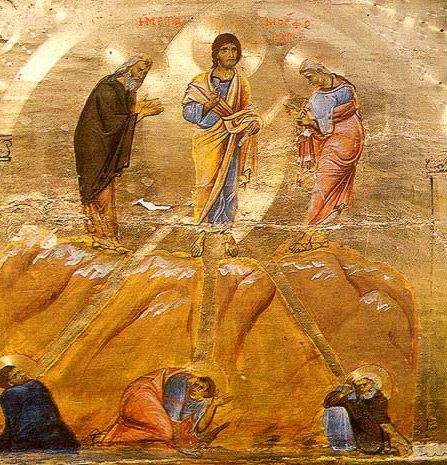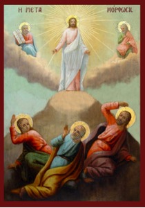 His three disciples, as they were tired from the difficult ascent to Tabor and while they sat down to rest, fell into a deep sleep. When they awoke, they saw an unexpected and exquisite sight. The face of the Lord shone like the sun, and His garments were white as light. Two men surrounded Him and talked with Him, Moses (see September 4) and Elias (see July 20).